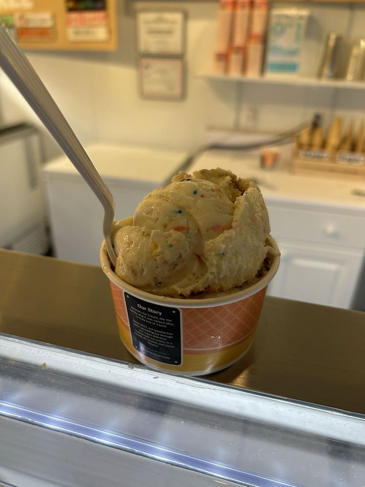 Yellow cake ice cream with real cake pieces, rainbow sprinkles, and blue buttercream. Allergens: contains wheat, milk, soy, egg.
