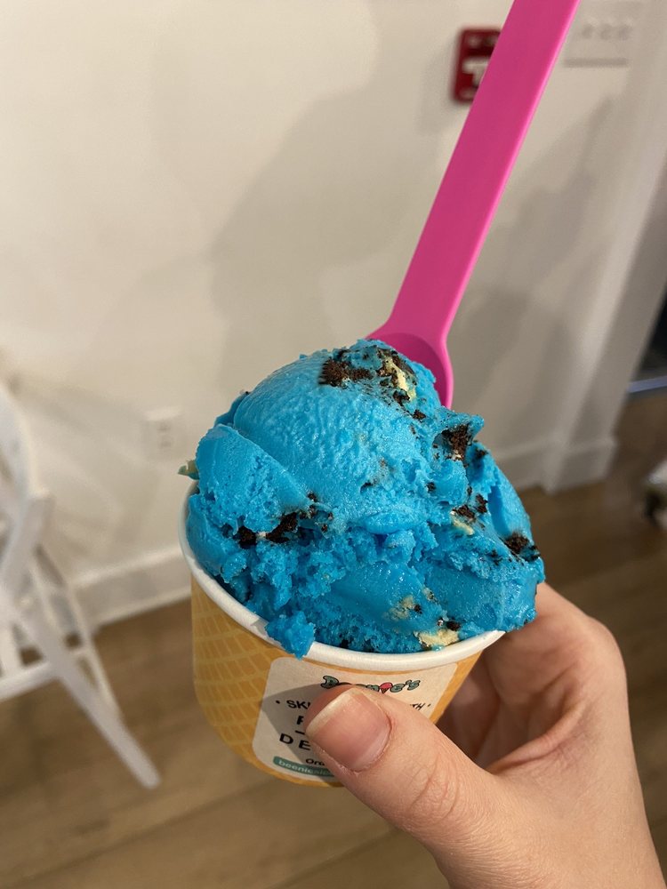 Blue cookie butter ice cream mixed with crushed Oreos and chocolate chip cookie dough bites. Allergens: contains wheat, milk, soy.